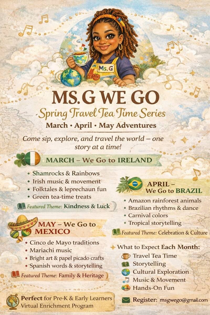 A guided imaginative, educational experience for young children (and caregivers) where you: "Travel" to a new place each session using storytelling props, music, snacks, and simple activities Blend SEL, geography culture, science, and literacy. It happens at tea time (late afternoon/early evening sweet spot). Ages 3-6 years old.